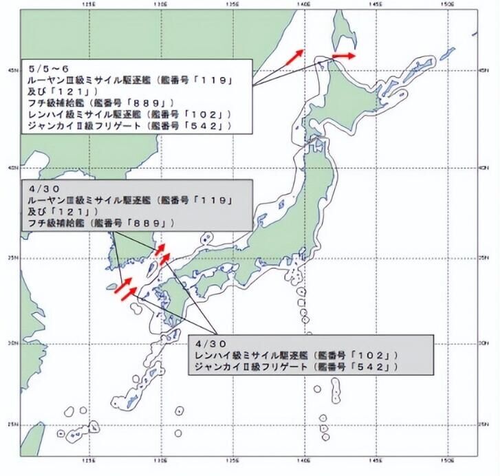 日本防卫省5月11日发布消息称,由一艘055型万吨大驱、一艘052D型驱逐舰、一艘054A型护卫舰以及一艘补给舰组成的中国海军舰艇编队4月30日从东海穿越对马海峡进入日本海,随后在5月6日从日本海穿航宗古海峡进入西太平洋。日本方面对于中国海军舰艇编队这次巡航表现得有点敏感,对此如何解读?