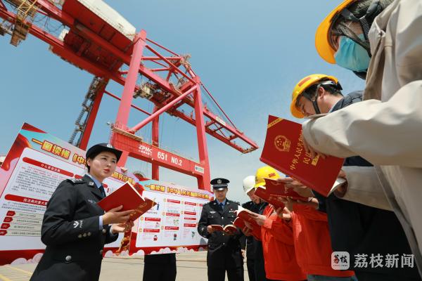 在镇江港国际集装箱码头有限公司,民警们向码头工人、船员和港区附近的居民群众发放了《中华人民共和国民法典》宣传手册,为群众解读《民法典》的相关内容,现场解答了大家日常工作生活中关心关注的劳资纠纷、经济纠纷、侵权责任、婚姻家庭、物业管理等方面问题咨询,引导广大群众知法守法,自觉运用法律武器维护自身权益、解决矛盾纠纷。