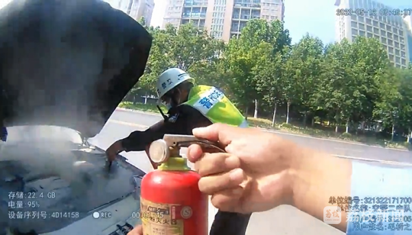 事发时,沭阳县公安局交警二中队辅警解严正在苏州路与台州路岗点执勤,突然看到一辆轿车前引擎盖上冒着浓烟停在路边,且车头部位有明火冒出,驾驶员停车求助。辅警解严见状顾不得多想,立即上前展开救援。沭阳县公安局交警二中队辅警解严介绍:“由于现场火太大,车上仅有的灭火器已经灭不了明火,我就果断地向过路的司机借用灭火器来救火。”
