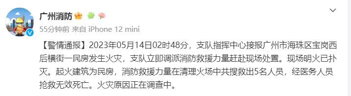 荔枝新闻讯 据“广州消防”微博消息,5月14日2时48分,支队指挥中心接报广州市海珠区宝岗西后横街一民房发生火灾,支队立即调派消防救援力量赶赴现场处置。现场明火已扑灭。起火建筑为民房,消防救援力量在清理火场中共搜救出5名人员,经医务人员抢救无效死亡。火灾原因正在调查中。