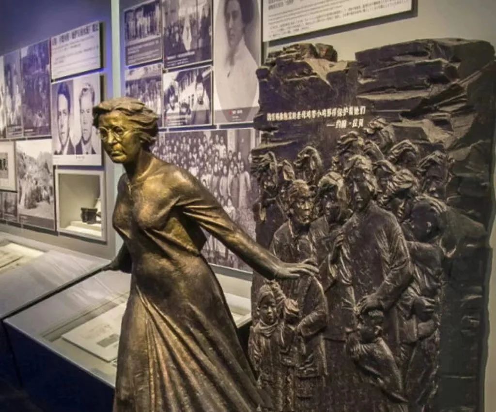 在纪念馆史料陈列厅内,矗立着她的一尊铜像,造型为伸开双臂,保护她身后惊恐万状的中国妇女和儿童。在这尊铜像的上方,镌刻着当年南京安全区国际委员会主席、德国友人约翰•拉贝说过的一句话:“魏特琳就像抱窝的老母鸡带着小鸡那样保护着她们(难民)!”