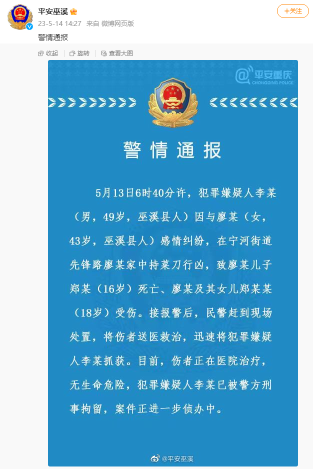荔枝新闻讯 据@平安巫溪 5月14日通报,5月13日6时40分许,犯罪嫌疑人李某(男,49岁,巫溪县人)因与廖某(女,43岁,巫溪县人)感情纠纷,在宁河街道先锋路廖某家中持菜刀行凶,致廖某儿子郑某(16岁)死亡、廖某及其女儿郑某某(18岁)受伤。接报警后,民警赶到现场处置,将伤者送医救治,迅速将犯罪嫌疑人李某抓获。目前,伤者正在医院治疗无生命危险,犯罪嫌疑人李某已被警方刑事拘留,案件正进一步侦办中。