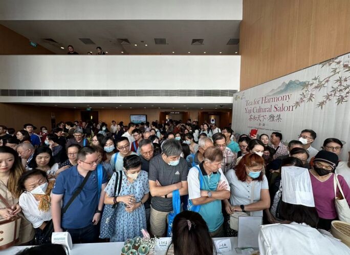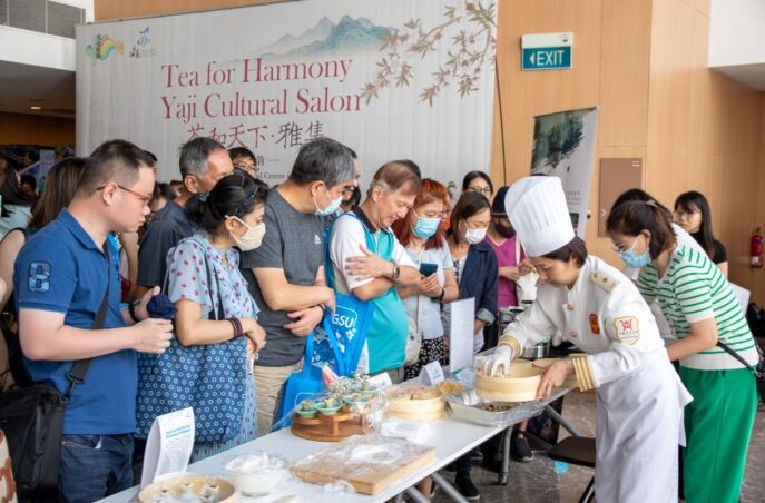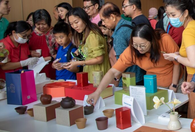 当日,“狮城”刷新了40年来历史最高温度,“茶和天下·苏韵雅集”的活动热度也一度飙升。从新加坡中国文化中心了解到,本次雅集的观众报名和参与人数远超预期。为了能让新加坡民众体验到原汁原味的江苏茶文化,雅集开启了互动体验模式:在现场不但能品尝到茶艺师泡制的各式江苏名茶,如苏州洞庭碧螺春、南京雨花茶、宜兴红茶、扬州魁龙珠;还能观看和品尝富春茶点制作技艺非遗传承人现制的富春茶点。此外,还有精美的宜兴紫砂茶壶作品和百年老字号苏州乾生元的各式茶点供民众鉴赏和品尝。