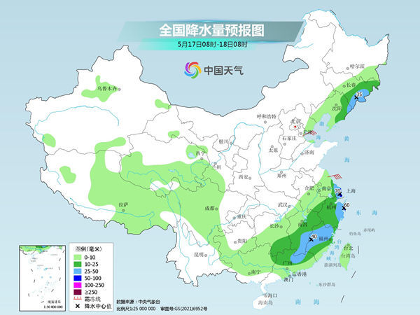 后天,东北地区东部、江南大部、华南北部等地部分地区有中到大雨,其中,江苏东南部、上海、浙江东北部等地部分地区有暴雨(50~70毫米)。