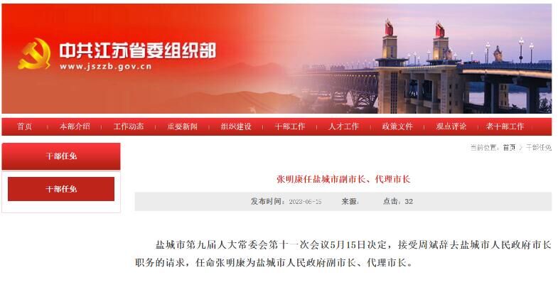 盐城市第九届人大常委会第十一次会议5月15日决定,接受周斌辞去盐城市人民政府市长职务的请求,任命张明康为盐城市人民政府副市长、代理市长。