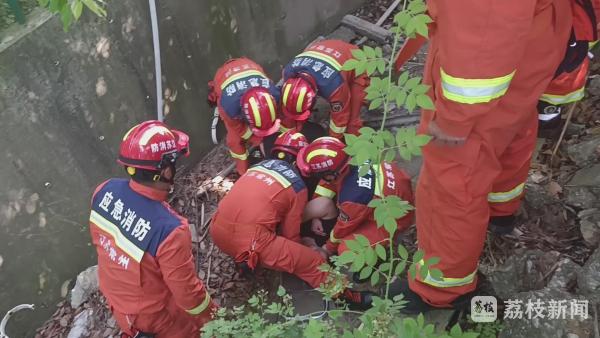 途中联系报警人得知:他们是医护人员,现场是一个男子掉入了排水沟,摔伤后无法动弹,由于排水沟距离地面将近2米,医院人员难以将其救出。救援人员赶到现场了解得知,男子肩胛骨受了伤,无法动弹。