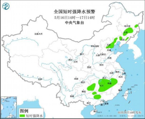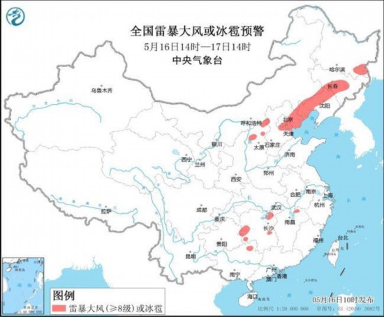 预计5月16日14时至17日14时,河北东北部及其近海、北京南部、天津、辽宁中西部和北部、内蒙古东南部、吉林中东部、黑龙江东南部、山西北部、湖南北部和西部等地的部分地区将有8-10级雷暴大风或冰雹天气;黑龙江东南部、吉林中部、辽宁中西部、河北东北部、北京东南部、天津北部、湖北东南部、湖南东部、江西中北部、贵州东部、广西东北部等地的部分地区将有短时强降水天气,小时雨量20-40毫米,局地可达50毫米以上。