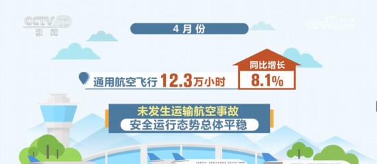 4月份,全行业完成运输航空飞行100万小时,同比增长281.5%;累计飞行40.7万架次,同比增长300.6%。通用航空飞行12.3万小时,同比增长8.1%。未发生运输航空事故,安全运行态势总体平稳。