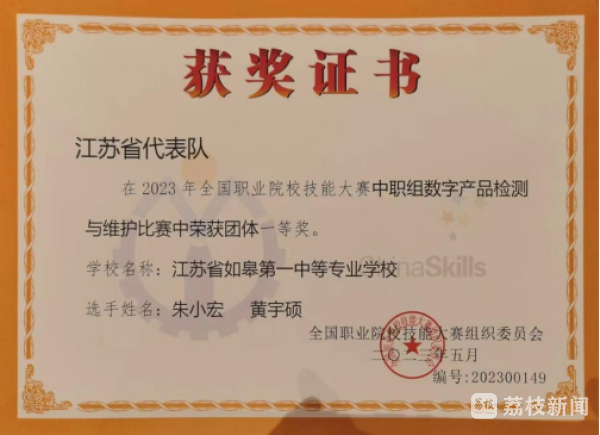 今天(5月16日),记者从南通市教育局获悉,5月14日,全国职业院校技能大赛在山东潍坊拉开帷幕,南通市如皋第一中等专业学校朱小宏、黄宇硕代表江苏参加数字产品检测与维护赛项的比赛。经过一天的激烈角逐,师徒二人勇摘国赛金牌,为江苏代表队中职组摘得本次国赛首枚金牌。