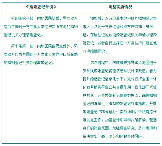 二、在试点地区,相应暂时调整实施《婚姻登记条例》第四条第一款、第十条第一款的有关规定(目录附后)。调整后,双方均非本地户籍的婚姻登记当事人可以凭一方居住证和双方户口簿、身份证,在居住证发放地婚姻登记机关申请办理婚姻登记,或者自行选择在一方常住户口所在地办理婚姻登记。