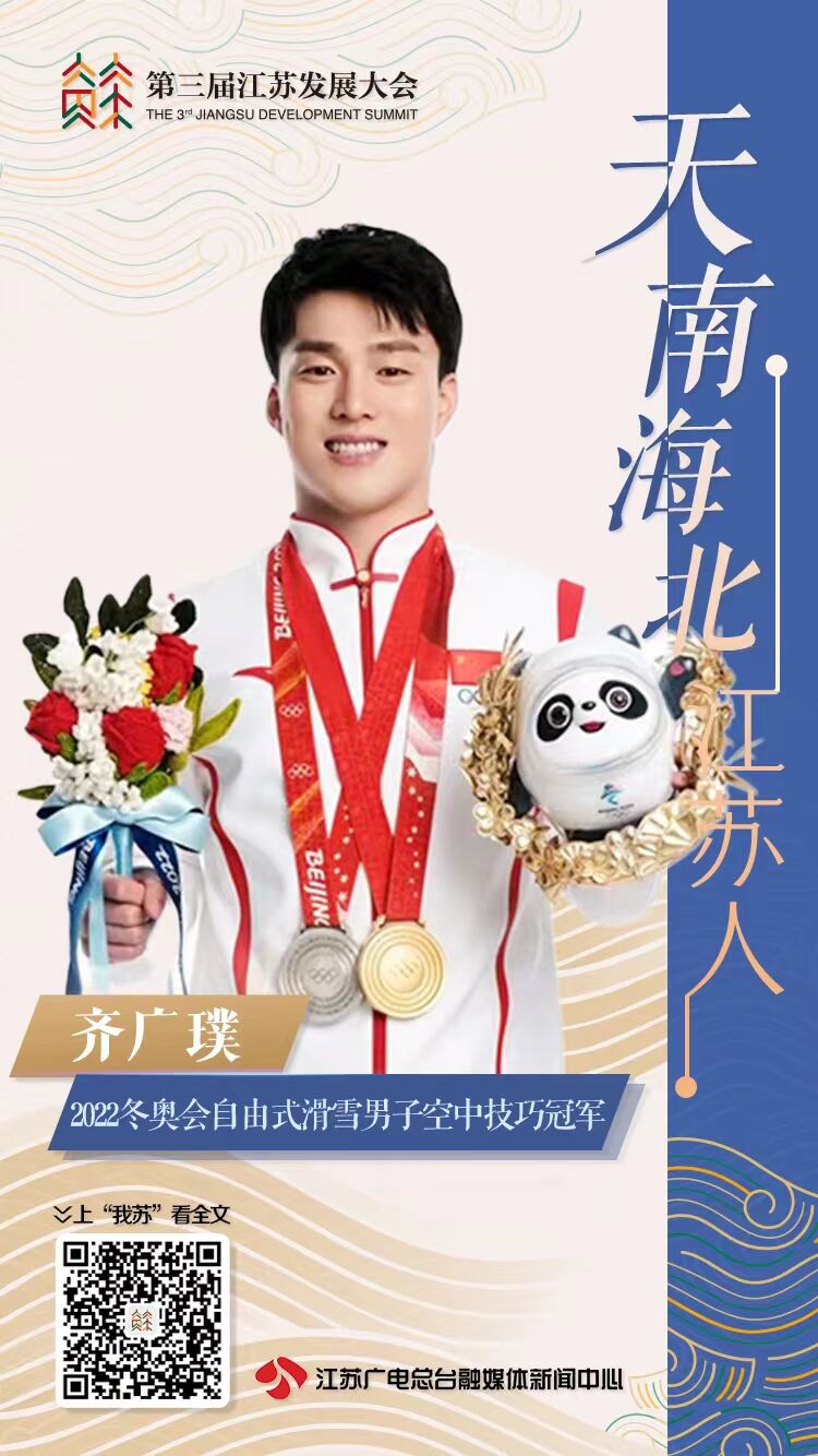 今天的《天南海北江苏人》特别报道,我们要带您去认识一位来自江苏的“空中飞人”。作为南方人,他在冰天雪地恣意飞翔、追逐梦想,用16年的不懈拼搏,站上了冬奥会的最高领奖台。他就是被誉为“世界难度第一人”的2022冬奥会自由式滑雪男子空中技巧冠军——齐广璞。