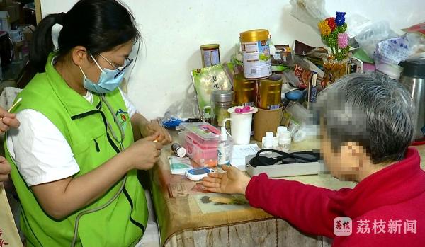 上午10点多,另一路家庭医生团队也来到68岁的居民潘女士家中。潘女士患有糖尿病、高血压等基础疾病,且经常血糖偏低,容易晕倒,所以家庭医生的定期上门服务对她来说格外重要。经过检查,潘女士的血糖依旧偏低,为了保证潘女士的人身安全,家庭医生建议她选择家庭养老床位,增加上门服务的频率。