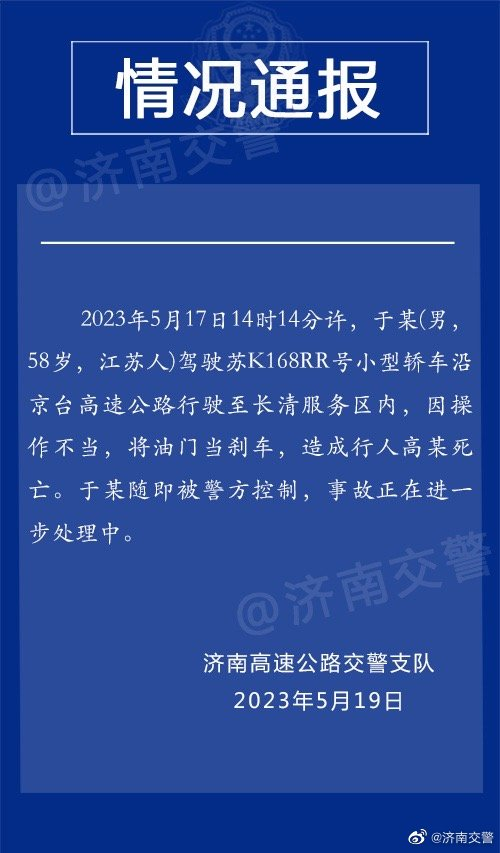荔枝新闻讯 5月19日,济南市公安局交通警察支队官方微博发布通报称,2023年5月17日14时14分许,于某(男,58岁,江苏人)驾驶苏K168RR号小型轿车沿京台高速公路行驶至长清服务区内,因操作不当,将油门当刹车,造成行人高某死亡。于某随即被警方控制,事故正在进一步处理中。