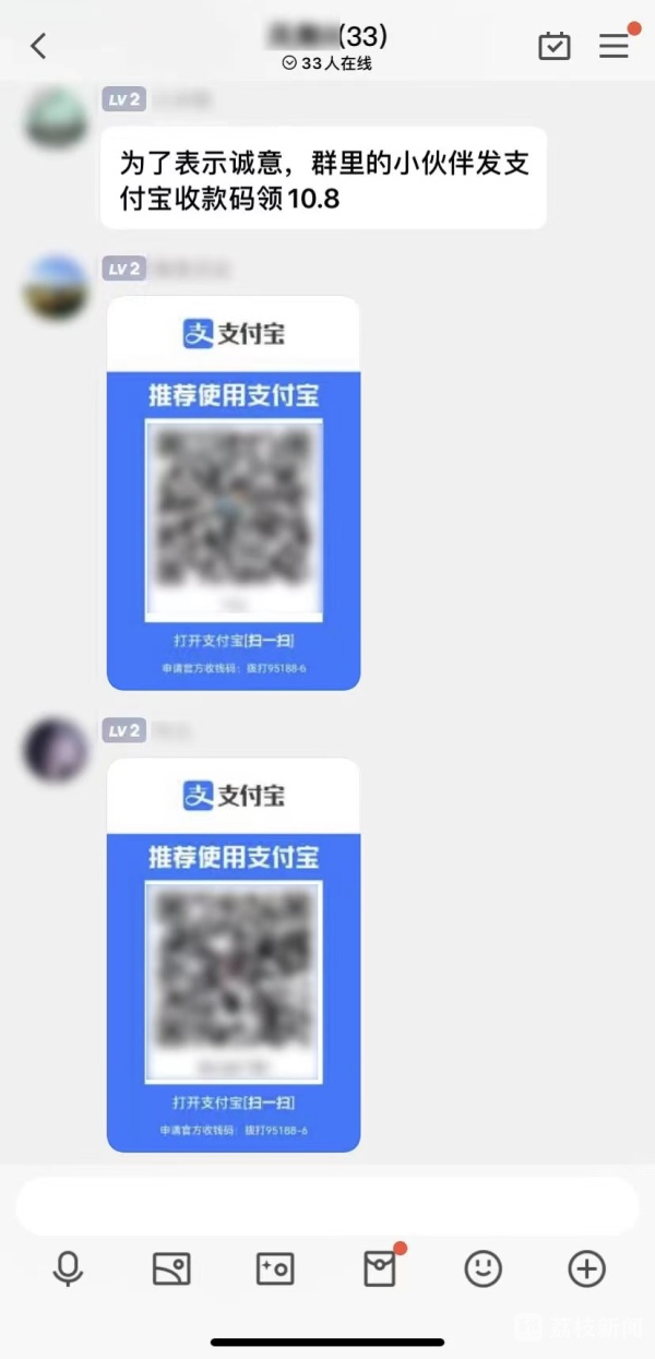 自称为了“表示诚意”,“小太阳”让群成员发支付宝收款码,告诉大家只要发收款码的“小伙伴”就可以领到10.8元。很快,下面陆续有人发了自己的支付宝收款码,并上传了自己领到10.8元的收款截图,群内气氛一下子热烈起来。