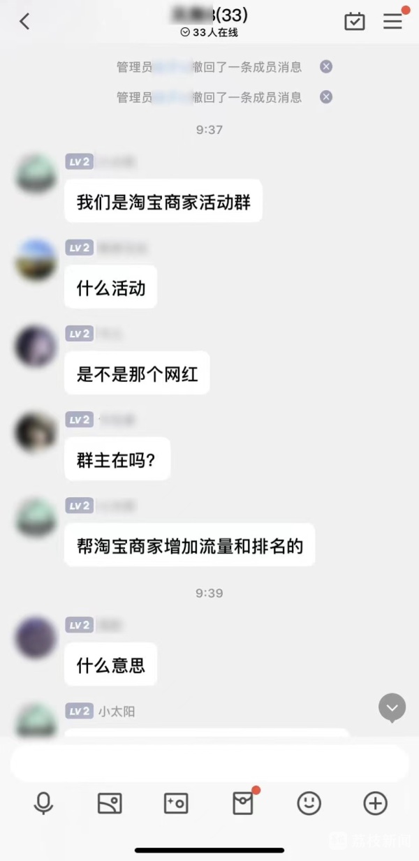 5分钟后,“小太阳”进入正题:“我们是淘宝商家活动群。帮淘宝商家增加流量和排名的,有报酬。”下面立即有人询问:“多少钱?”“什么报酬说出来听听。”“不勉强,想做做兼职的可以,每天工资150+。”“小太阳”还强调,“真实有效的哦,不是骗人的。”