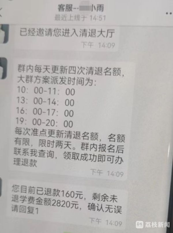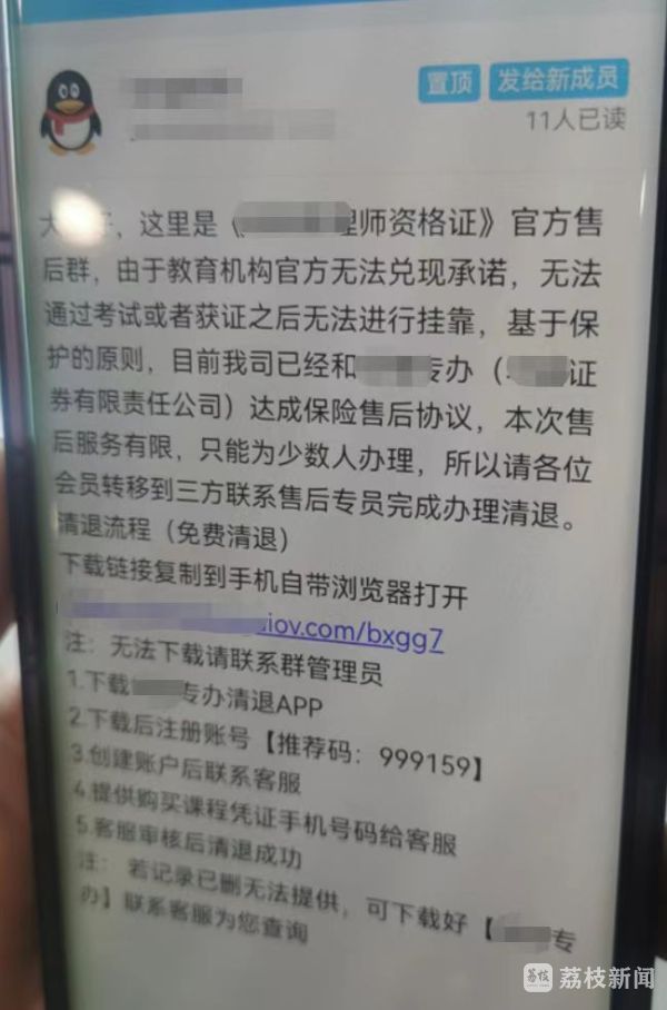 最近,市民李女士手机上收到几十条不同号码发来的短信,提示她之前在教育机构报名的学费可以退费了,但退费名额有限,想退费需要添加聊天群进行申请。本有些将信将疑的李女士,在多条短信“轰炸”下,抱着试试看的态度加入了退费群。