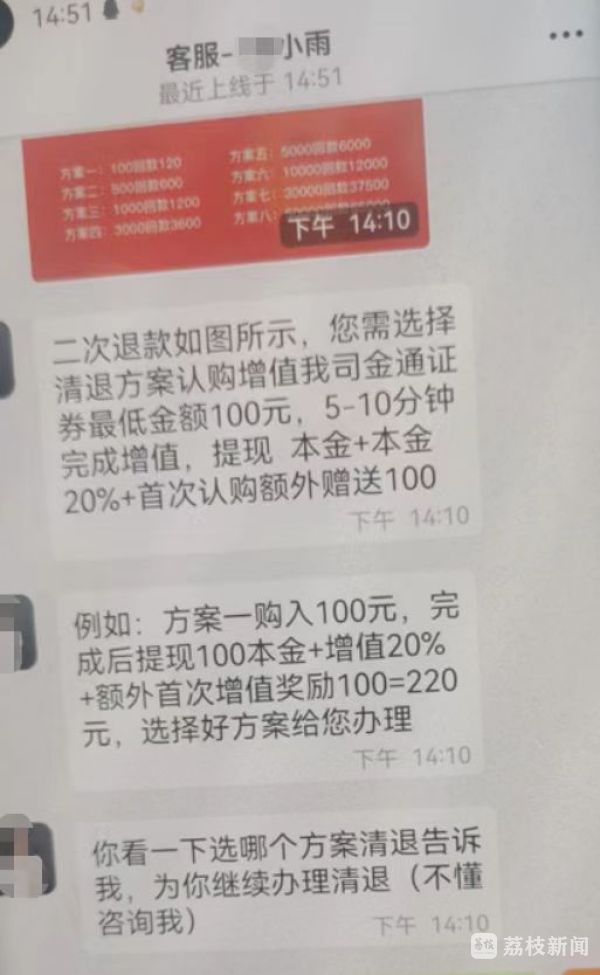 进群后,一名备注客服的人在群里发布信息称,需先下载一款软件,待注册成功后将会按顺序退费。李女士按对方的要求,点击链接,下载该软件。注册完成后,一名自称“售后专员”的人与李女士取得联系,简单沟通之后便为她提供了退费方案,称想要办理退费,必须选择购买证券方案,并保证所购买的证券百分之百增值,根据该证券的行情将会有20%的增值收益,所增值的部分便可以提现出来当做清退的学费,直到全部学费返还完成。
