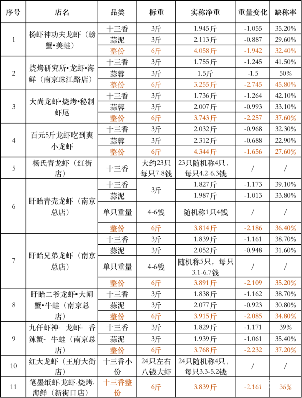 本次调查通过外卖平台、超市自营平台等途径购买熟食龙虾,同时购买活虾自行烹饪制作称重对照。首先分别选取3家提供外卖服务的主流平台中品牌龙虾门店或销量较多的11个商家,1个商家1份样本,共计11份;超市自营平台方面,分别选择3家自营超市的APP下单体验,每家各下单1份,合计3份。调查咨询了餐饮行业相关专业人员,了解到活虾烹制后损耗率一般应当在20%以内。