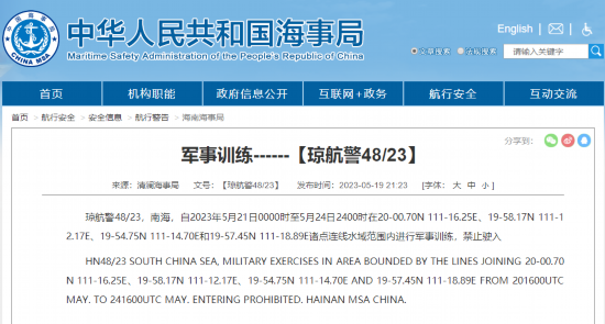 琼航警48/23,南海,自2023年5月21日0000时至5月24日2400时在20-00.70N 111-16.25E、19-58.17N 111-12.17E、19-54.75N 111-14.70E和19-57.45N 111-18.89E诸点连线水域范围内进行军事训练,禁止驶入。