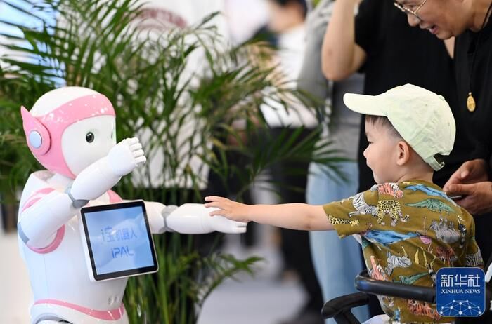 5月19日,一名儿童在第七届世界智能大会智能科技展上和一款机器人互动。新华社记者 赵子硕 摄