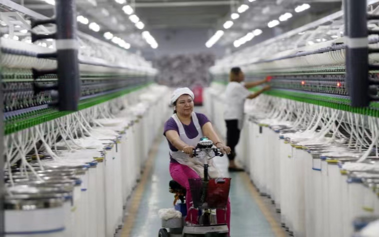 近日,记者走进新疆维吾尔自治区伊犁哈萨克自治州伊宁县纺织产业园的新疆贻程纺织科技有限公司,车间内机器轰鸣,雪白的棉纱整齐排列,工人们骑着电动车穿梭在生产线,一派热火朝天的景象。