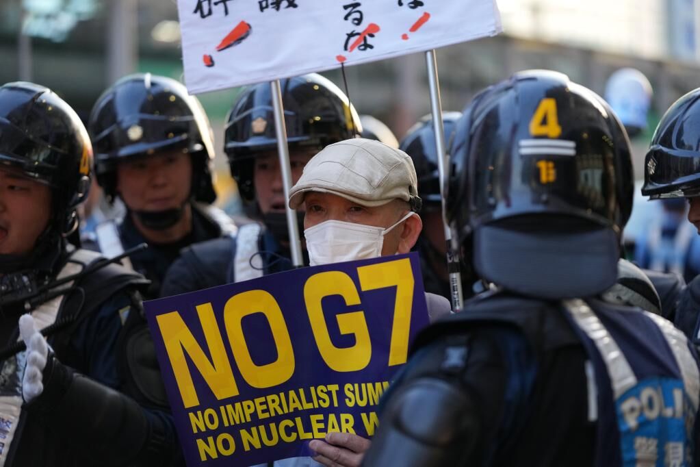 5月17日,民众在日本广岛举行抗议活动,反对七国集团峰会。日本出动大量警力应对。新华社记者张笑宇摄
