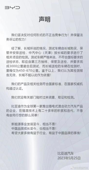 比亚迪称,经了解,长城所说的情况,测试车辆由长城购买、保管并安排送检,中汽中心(天津) 按长城的要求进行了相关项目的检测。测试车辆严格来说,不符合国标要求的送检状态,即应由第三方抽样、保管及送检,并要求完成3000公里磨合后测试,而长城送检的车辆在检测时里程仅为450-670公里。