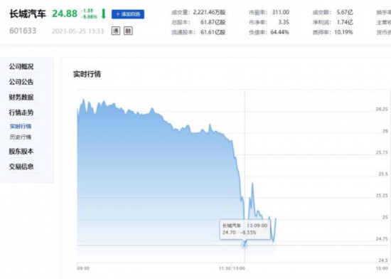 记者注意到,长城汽车、比亚迪股价25日午后跳水。长城汽车股价一度跌超6%,比亚迪一度下跌超2%,此后均略有回升。