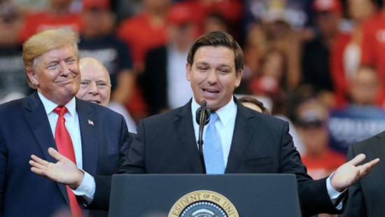 特朗普注视着德桑蒂斯发表讲话