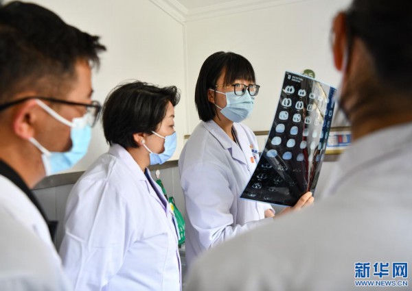 拉萨市人民医院呼吸与危重症医学科主任杨苏乔(右二)查房会诊(4月28日摄)。新华社记者 晋美多吉 摄