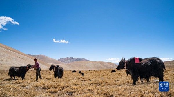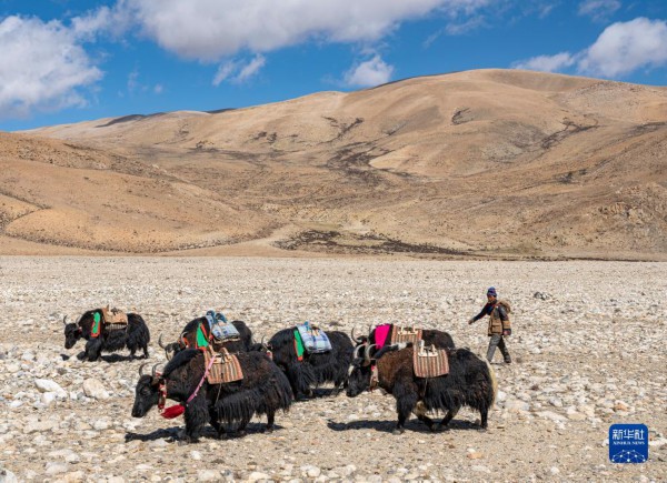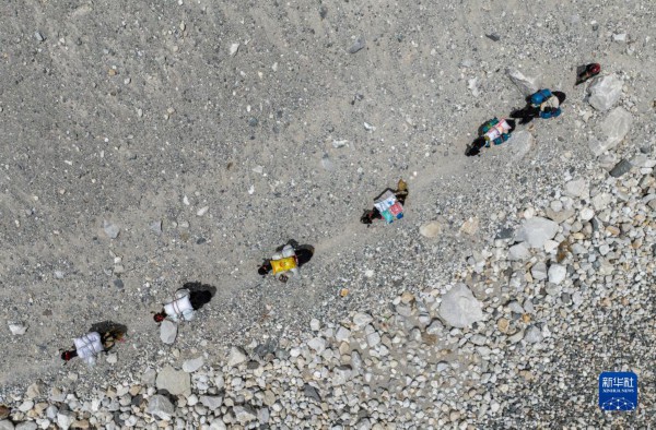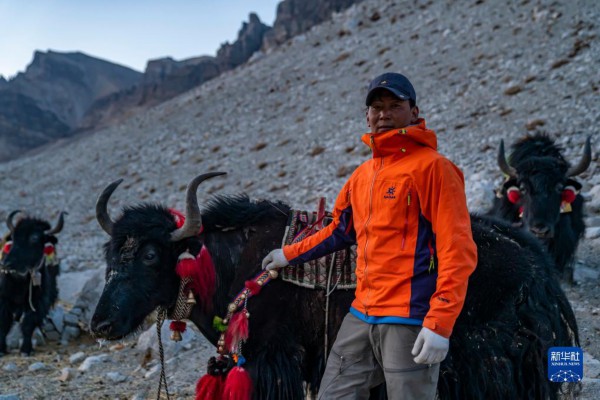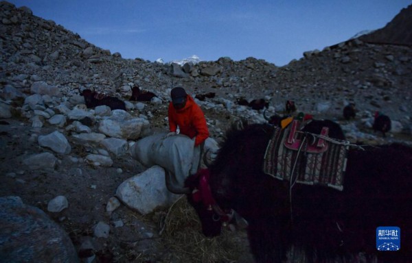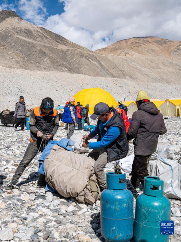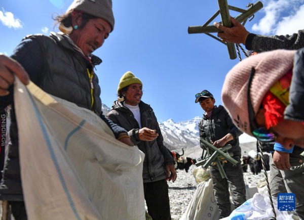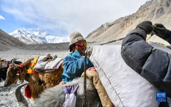 无论是在1960年中国登山队首登珠峰这样的大型国家登山任务里,还是后续兴起的北坡商业登山活动中,亦或是历次珠峰大型科考活动中,都有扎西宗乡农牧民赶着牦牛驮运物资上山的身影。图为在珠峰登山大本营,牦牛工捆扎待运输的物资(5月18日摄)。新华社记者 孙非 摄