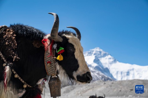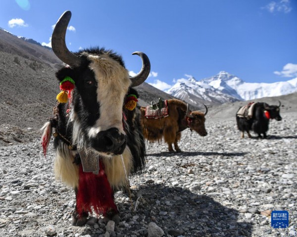 运输队的工作流程是固定的——牦牛工先把牦牛赶到海拔5200米的珠峰登山大本营,在那里将氧气瓶、帐篷等物资驮置到牦牛背上,组成牦牛运输队,再出发前往海拔6500米的珠峰前进营地。图为在珠峰登山大本营,一头牦牛在等待驮运物资(5月18日摄)。新华社记者 孙非 摄