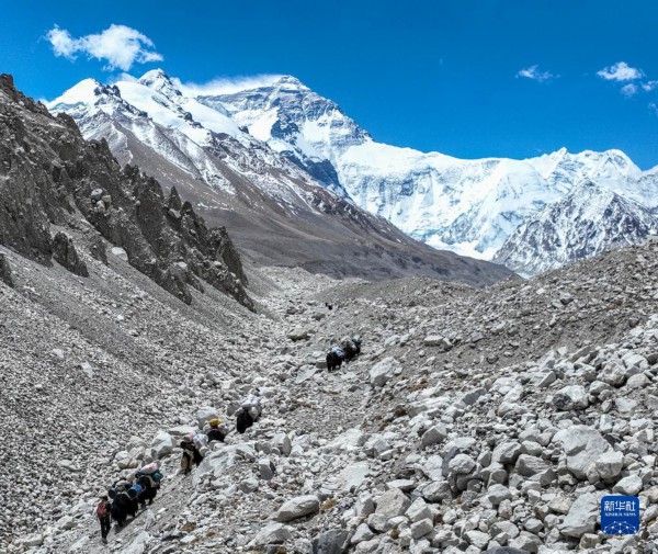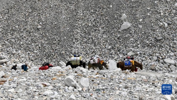 牦牛运输队向海拔6500米的珠峰前进营地进发(5月12日摄)。新华社记者 晋美多吉 摄
