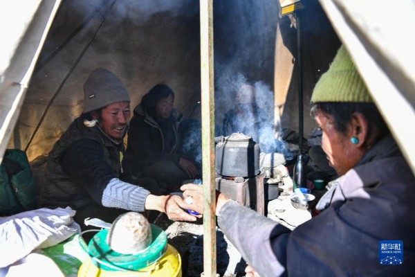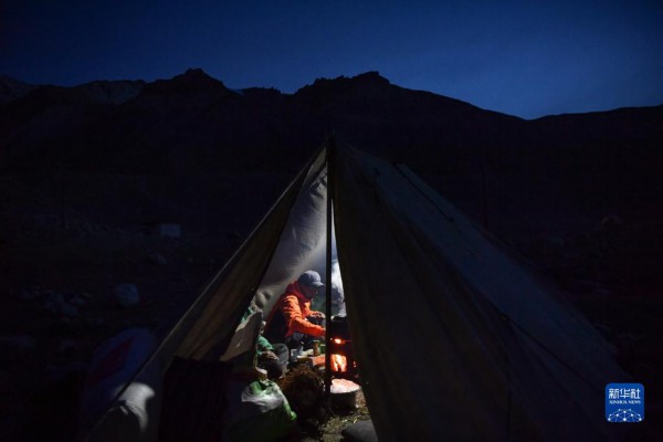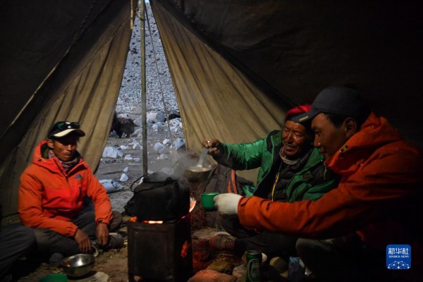西藏定日县扎西宗乡是我国境内距离珠峰山体最近的行政乡。在当地老人们的口中,“扎西宗的牦牛背上,驮着整个人类从北坡攀登珠峰的历史。”珠峰山区特殊的自然环境,使得牦牛驮运成为珠峰登山、科考和探险等活动中运输物资最主要的方式。应运而生的牦牛工,成为扎西宗乡壮年劳动力在每年登山季里的固定工作。图为在珠峰登山大本营附近的帐篷里,牦牛工烧水煮茶(5月17日摄)。新华社记者 晋美多吉 摄