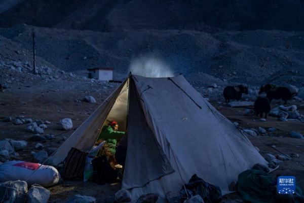 现如今,除了运输物资,牦牛工和牦牛运输队还承担沿途捡拾垃圾、运送垃圾下山的职责。班丹说,全世界只有一个珠峰,“我们要共同守护好她。图为在珠峰登山大本营附近帐篷里的牦牛工(5月18日摄)。新华社记者 晋美多吉 摄”