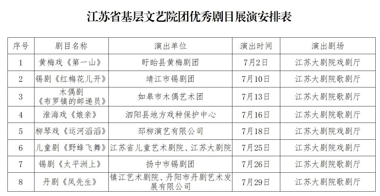 参加巡演的20部作品中,有6部在南京演出,13部在全省其他12个设区市演出,1部赴省外交流演出;江苏省基层文艺院团优秀剧目展演8部剧目全部在江苏大剧院集中展演。