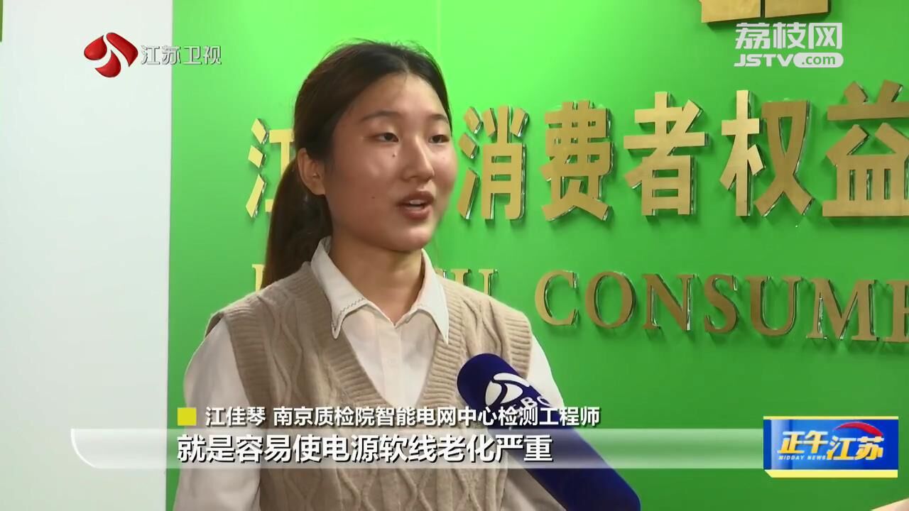 南京质检院智能电网中心检测工程师江佳琴说:“输入功率跟电流过大,容易使电源软线老化严重,长期使用会烧坏电器中的元器件,可能会引起火灾。电源软线的标称横截面积,国家标准是不应该小于0.5平方毫米。在我们本次检验过程中,发现它的标准横截面积是小于0.5平方毫米的。如果产品在全负荷工作的话,就会加速电源软线的老化,可能会有触电危险。”