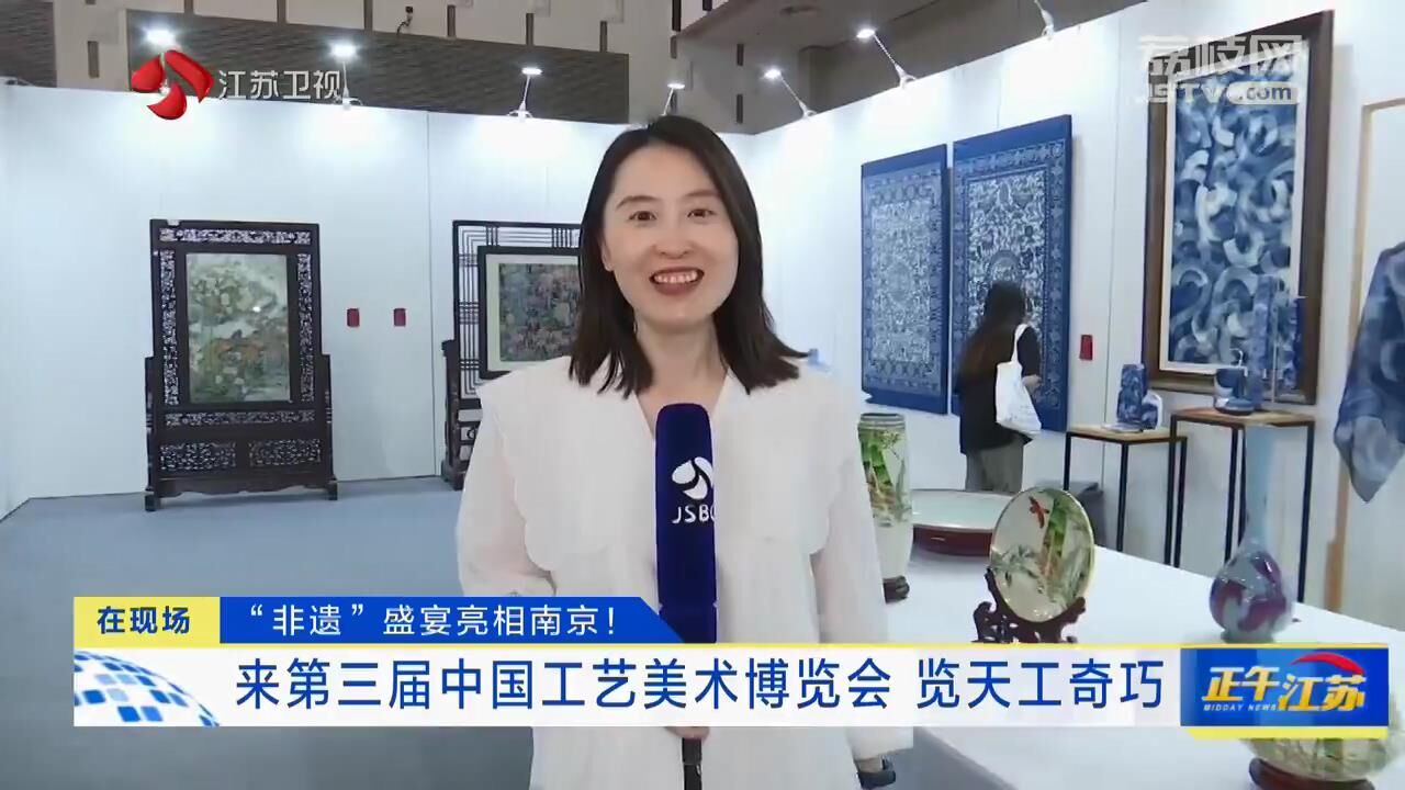 江苏台记者黎明报道:“百位工艺美术大师齐聚,数万件精品瑰宝扎堆,十八般非遗项目等你来体验……5月26日,第三届中国工艺美术博览会,正式亮相南京国际博览中心。作为我国最大的工艺美术专业展会,本次博览会共设四大展馆,分别是特色产区馆、国瓷馆、雕刻馆和综合馆,陶瓷、雕刻、织染、文房四宝、珠宝首饰、家具工艺、文创设计应有尽有,华夏的天工奇巧一览无余。”