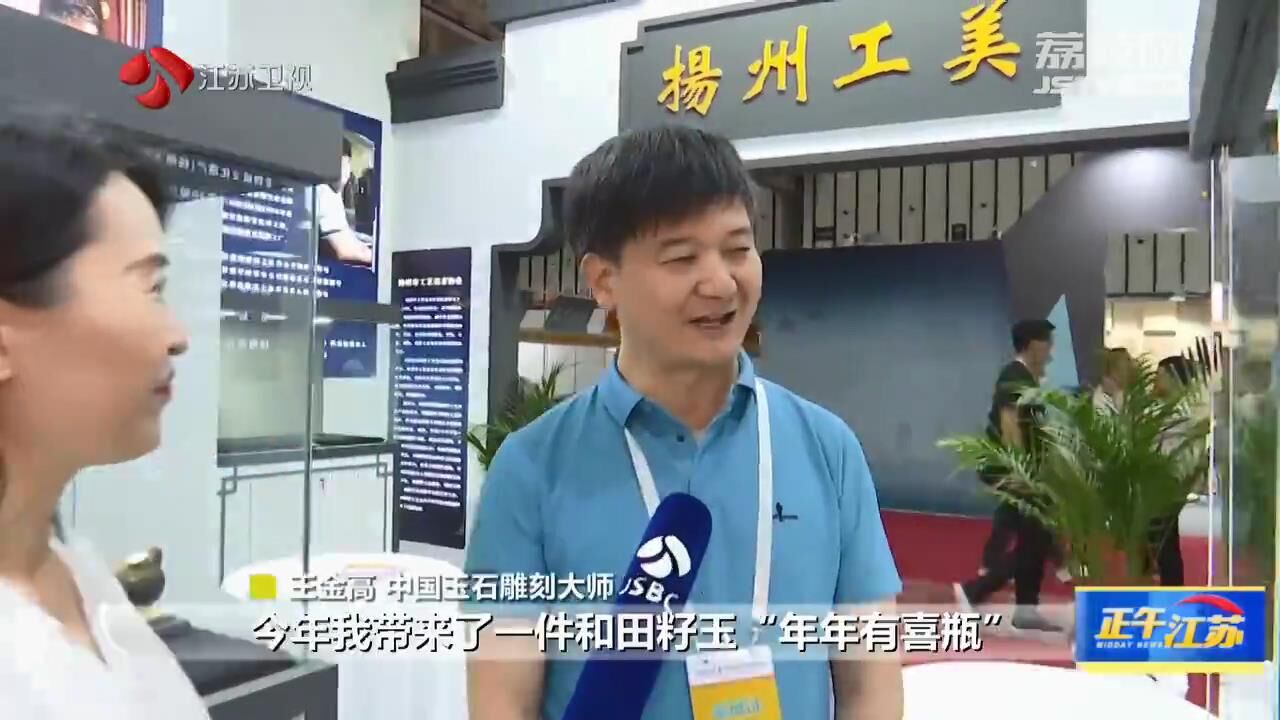 黎明:“在特色产区馆,全国50个极具地方特色的展团悉数亮相,‘国宝们’争奇斗艳,百花齐放。比如在扬州工美专区,汇聚了知名玉雕大师最新的精品力作,充分彰显‘天下玉、扬州工’的技艺传承。我身边就是中国玉石雕刻大师王金高。王老师您今年带来了什么样的作品?”