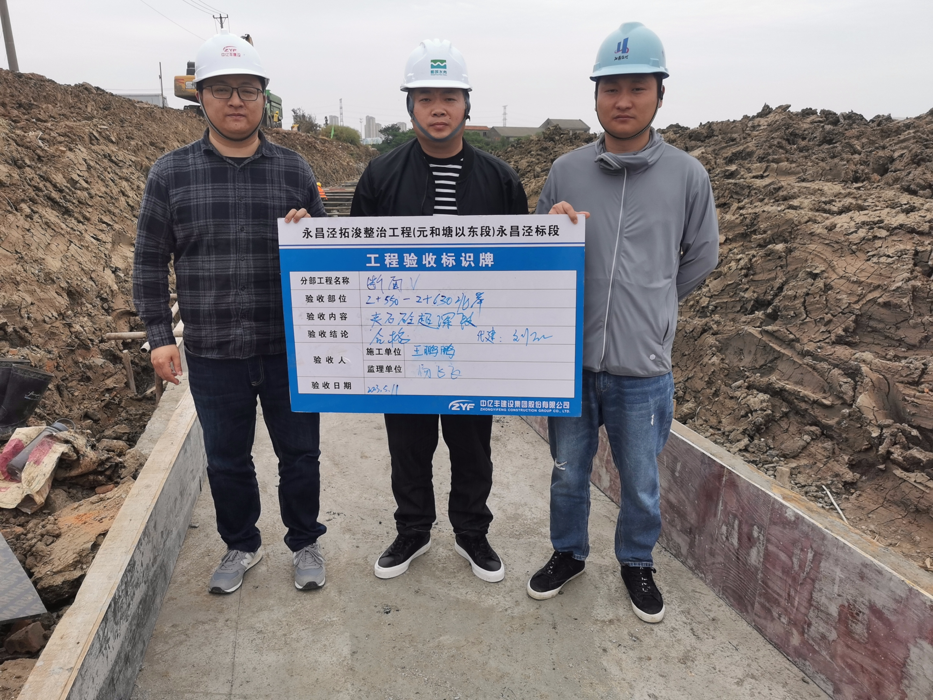 “分部工程名称、验收部位、验收内容、验收结论、验收人、验收日期……”,在永昌泾拓浚整治工程(元和塘以东段)河道挡墙建设现场,项目管理人员与《工程验收标识牌》合影,该影像连同工序单元质量评定资料、验收资料等一并归入工程档案,作为阶段验收和完工验收的依据之一,这是苏州市相城区首次在水利工程建设中实施“举牌验收”制度。
