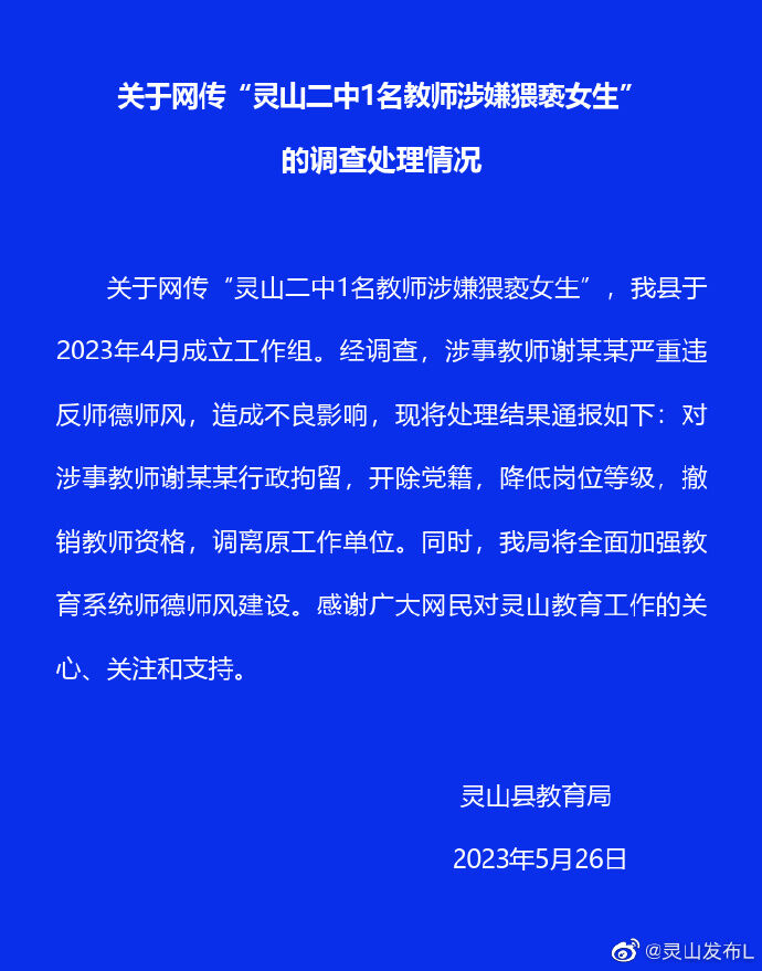 关于网传“灵山二中1名教师涉嫌猥亵女生”,我县于2023年4月成立工作组。经调查,涉事教师谢某某严重违反师德师风,造成不良影响,现将处理结果通报如下: 对涉事教师谢某某行政拘留,开除党籍,降低岗位等级,撤销教师资格,调离原工作单位。同时,我局将全面加强教育系统师德师风建设。感谢广大网民对灵山教育工作的关心、关注和支持。