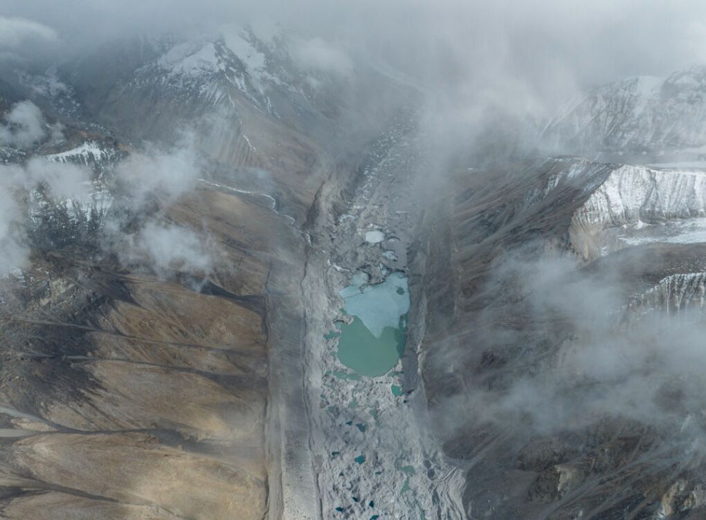 ↑这是在海拔7000米左右高空拍摄的由绒布冰川融水形成的湖泊群(5月25日摄,无人机照片)。新华社发(旦增努布 摄)