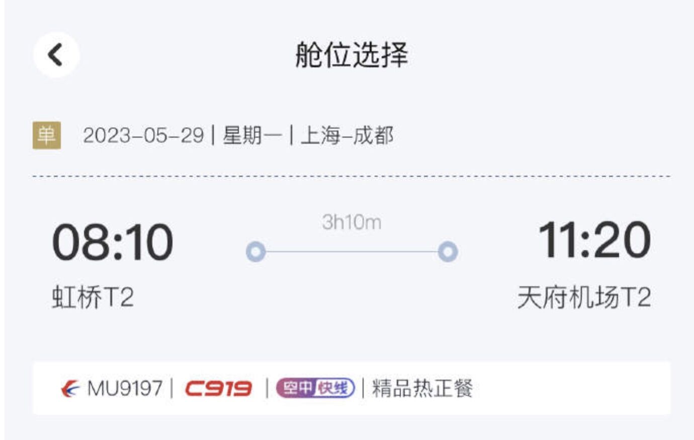 据交通发布微博消息,东航App当前已开售C919客运航班机票,航线为上海虹桥—成都天府,经济舱机票价格为919元起。详情>>