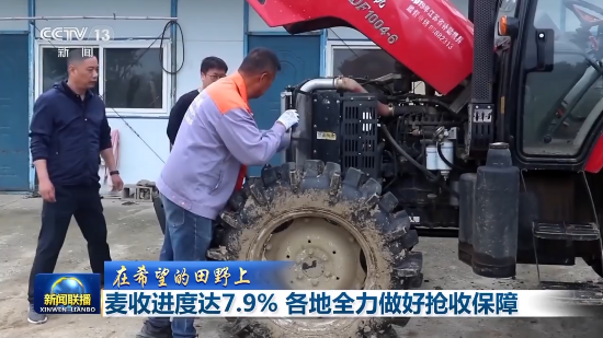 总台央视记者 刘成:我现在是在河南省汝南县三桥镇的麦田里,刚刚下过的一场雨让麦田变得特别松软。趁着不下雨的空当,应急服务队紧急调来四台履带式收割机帮忙抢收。