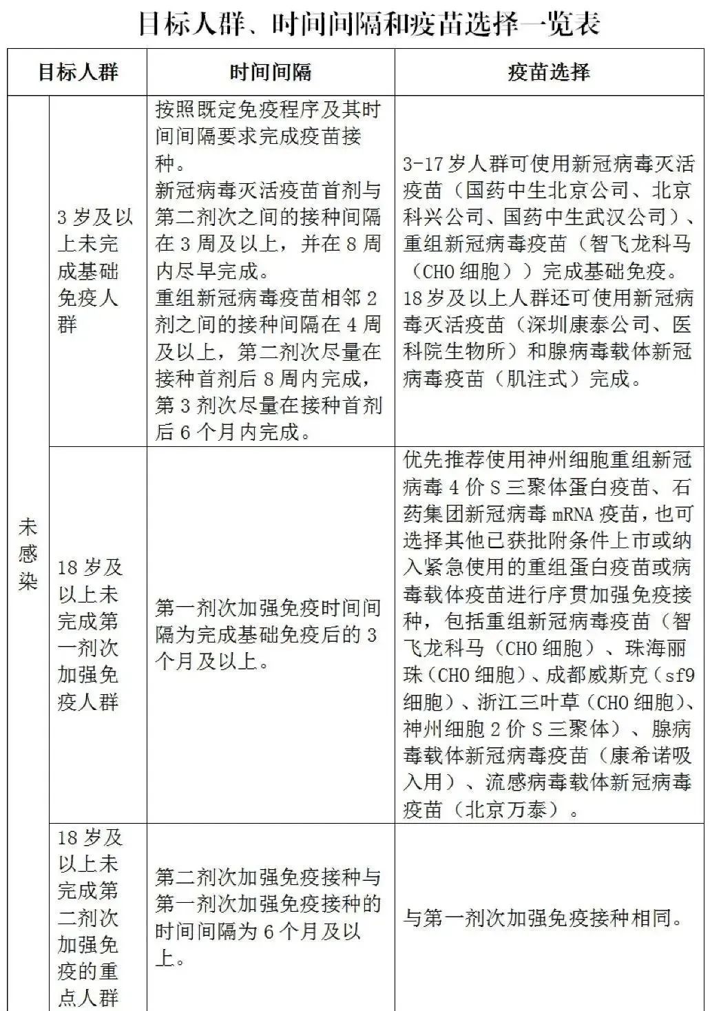 未感染人群基础免疫可选择新冠灭活疫苗、智飞重组疫苗和腺病毒肌注疫苗;加强免疫优先推荐神州细胞重组新冠病毒4价S三聚体蛋白疫苗和石药集团mRNA疫苗,也可选择其他已获批附条件上市或纳入紧急使用的重组蛋白疫苗或病毒载体疫苗进行序贯加强免疫接种。具体情况见下表。