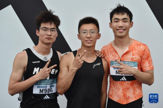 5月28日,冠军南京师范大学选手韩泽芃(中)、亚军南京财经大学选手陈泽锐(左)、季军南京师范大学选手王子霂在赛后合影。新华社发(方东旭 摄)