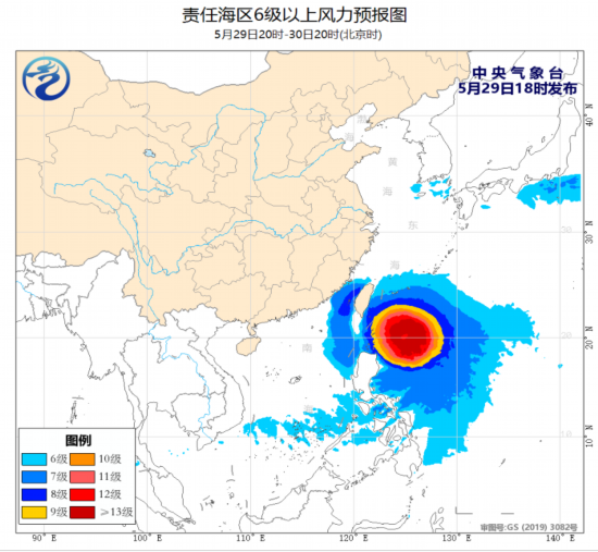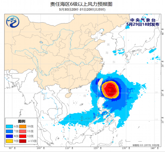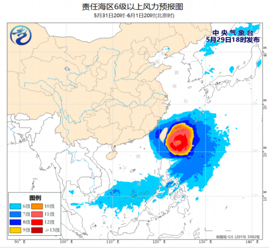 5月29日夜间至6月1日白天,受台风“玛娃”影响,巴士海峡、台湾以东洋面、台湾海峡、南海东部和南部海域、东海南部海域将有6~8级、阵风9级的风,其中台湾以东洋面和巴士海峡部分海域风力可达9~10级、阵风11~12级。