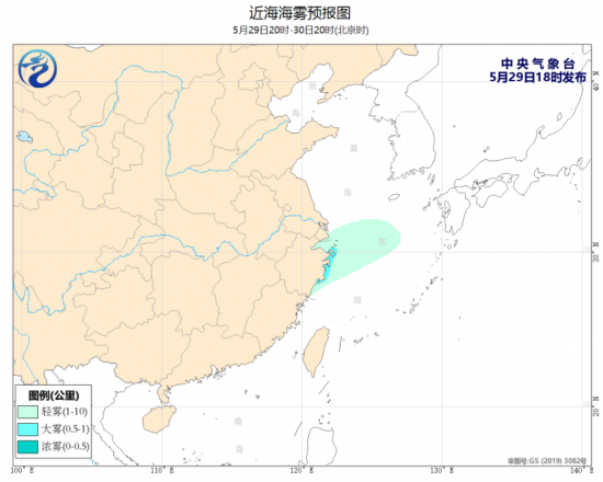 5月29日夜间,东海西北部海域、浙江沿岸海域将有轻雾,能见度不足10公里,其中浙江中部部分沿岸海域将有大雾,能见度不足1公里。