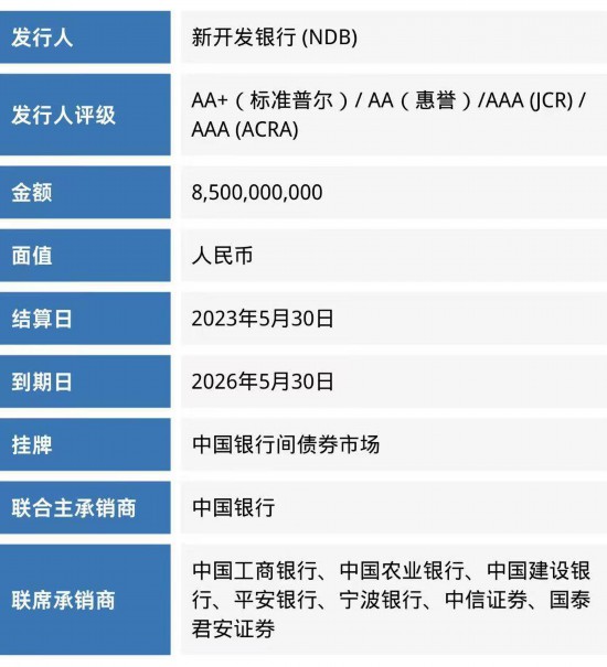 5月29日,新开发银行 (NDB) 在中国银行间债券市场成功发行 85 亿元人民币熊猫债。此次发行体现了新开发银行多元化参与资本市场、动员资源支持可持续发展项目融资的战略,发行规模超过了新开发银行此前70亿元人民币的单笔最大的熊猫债发行规模。通过此次交易,新开发银行在中国银行间债券市场建立了新的熊猫债债券基准。该笔交易吸引了境内和境外投资者的关注和参与,最终以负溢价为债券成功定价。本期债券的募集资金将为新开发银行支持的基础设施和可持续发展项目提供融资,支持成员国发展和促进实现可持续发展目标。募集资金可以人民币和/或兑换成其他货币汇出投资于境外。本次债券的发行得到了投资者的广泛关注和踊跃认购,反映了投资者对新开发银行的信心以及银行在市场上的良好声誉。