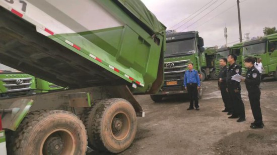 在检查中,执法人员发现其中一辆车的密闭装置出了问题:尾部有一块1米多长的破损,渣土容易从此处泄漏出来,造成扬尘。执法人员随即下发整改通知书,要求尽快修复或更换该车辆的密闭装置,待验收合格后才可以运营。在另一辆渣土车上,执法人员发现该车车身上的公司名称、放大车牌号码等标识都已经磨损得无法辨识,随即要求该公司对该车重新喷涂标识,确保清晰、醒目。